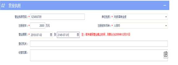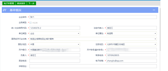 5.之后完善企業(yè)相關(guān)信息:業(yè)務(wù)類型、企業(yè)名稱、統(tǒng)一社會信用代碼、法定代表人、開戶銀行、負(fù)責(zé)人等信息;