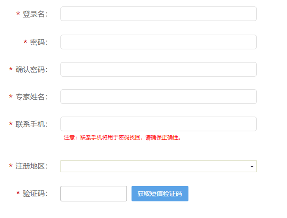 4.在專家注冊頁面,據(jù)實填寫完善相關(guān)信息并獲取驗證碼,點擊